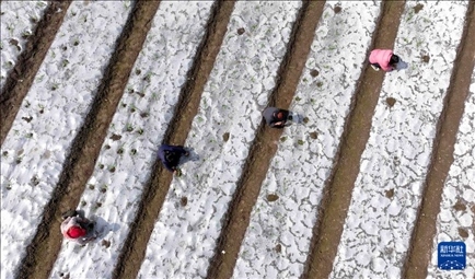 3月4日,村民在羅甸縣逢亭鎮(zhèn)粵港澳大灣區(qū)蔬菜保供基地種鮮食玉米(無人機照片)。
