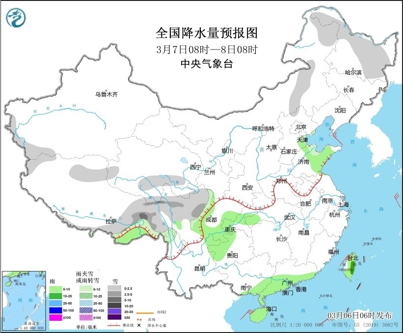 圖1 全國(guó)降水量預(yù)報(bào)圖(3月6日08時(shí)-7日08時(shí))