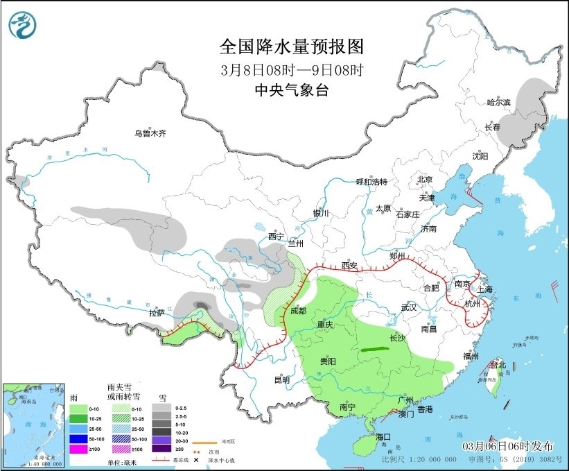 3月8日08時(shí)至9日08時(shí),東北地區(qū)東部、西藏東部、青海東部、甘肅南部、川西高原北部等地部分地區(qū)有小雪或雨夾雪,其中,西藏東部等地部分地區(qū)有中到大雪。江南南部和西部、西南地區(qū)東部、華南等地部分地區(qū)有小雨,其中,湖南中西部等地部分地區(qū)有中雨(見(jiàn)圖3)。