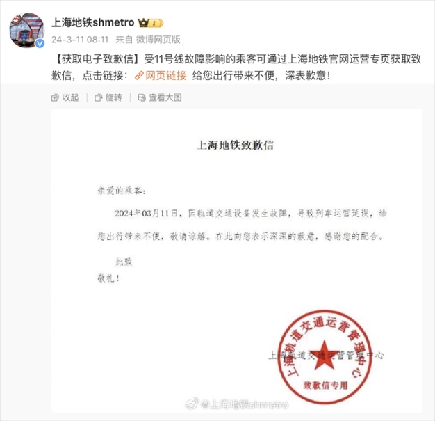 央視網(wǎng)消息:@上海地鐵shmetro 今早消息,上海地鐵今早消息,11號線因車輛故障,嘉定新城往武威路方向列車限速運行,發(fā)車班次間隔延長,預(yù)計晚點15分鐘以上,請乘客們及時調(diào)整出行路徑,以免耽誤行程。隨后,上海地鐵官方向全體乘客發(fā)布致歉信表示歉意。目前,11號線運營已恢復正常。