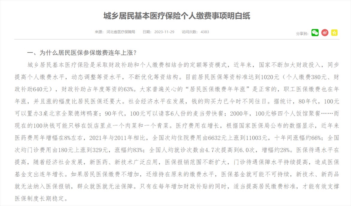 記者注意到,河北省醫(yī)保局去年11月份曾發(fā)布《城鄉(xiāng)居民基本醫(yī)療保險(xiǎn)個(gè)人繳費(fèi)事項(xiàng)明白紙》,其中就“為什么居民醫(yī)保參保繳費(fèi)連年上漲?”問題回應(yīng)稱:“大家普遍關(guān)心的‘居民醫(yī)保繳費(fèi)年年漲’是正常的,職工醫(yī)保繳費(fèi)也在年年漲,并且漲的幅度比居民醫(yī)保還要大。社會(huì)經(jīng)濟(jì)水平在發(fā)展,錢的購買力已今時(shí)不同往日,醫(yī)療費(fèi)用在增長,醫(yī)保待遇水平在提高。如果居民醫(yī)保繳費(fèi)不增加,還維持在原來的繳費(fèi)水平,醫(yī)?;鹁涂赡懿豢沙掷m(xù),新技術(shù)、新藥品就無法納入醫(yī)保報(bào)銷,群眾就醫(yī)就無法保障?!?/p>