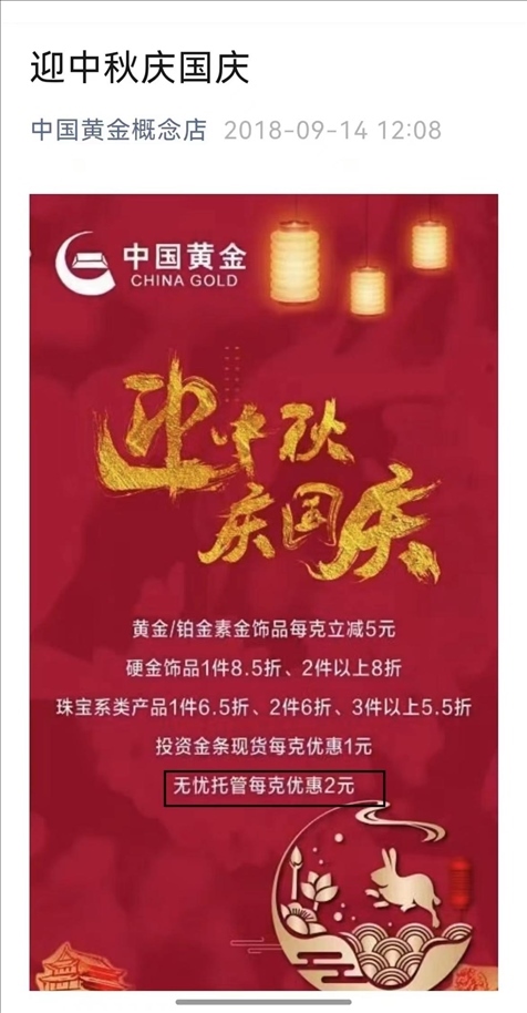 2018年,涉事門店的公眾號仍在宣傳無憂托管業(yè)務(wù),消費者質(zhì)疑中國黃金方面,為何沒有發(fā)現(xiàn)這家店經(jīng)營公司禁止的業(yè)務(wù)/受訪者供圖