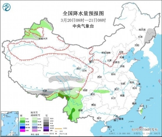 3月20日08時(shí)至21日08時(shí),黑龍江東南部、吉林東部、新疆沿天山地區(qū)、西藏東部和南部、青海南部、川西高原中部等地部分地區(qū)有小到中雪或雨夾雪,其中,西藏東部、川西高原中部等地部分地區(qū)有大雪。西藏東南部、四川南部、云南中西部等地部分地區(qū)有小雨,其中,西藏東南部、云南中西部等地部分地區(qū)有中雨。