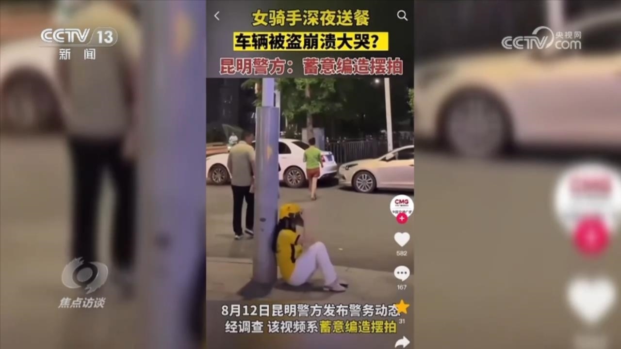 2023年8月3日,某網(wǎng)絡(luò)平臺(tái)發(fā)布了一個(gè)短視頻,除了哭泣聲,上面文字打的是“深夜,外賣姐姐送餐,下樓發(fā)現(xiàn)車被偷了”。然而,就是這樣一個(gè)時(shí)長(zhǎng)僅10秒左右的視頻,當(dāng)晚瀏覽量已超6000萬次,并在多個(gè)平臺(tái)迅速傳播,進(jìn)入熱榜,隨即點(diǎn)贊、收藏量超過10萬次。同樣,這些也引起了警方的關(guān)注,經(jīng)調(diào)查核實(shí),該視頻為擺拍,發(fā)布者就是畫面中表演的女子,其丈夫在旁負(fù)責(zé)道具和指導(dǎo)。而他們當(dāng)時(shí)擺拍的全過程被大街上的戶外監(jiān)控記錄了下來。