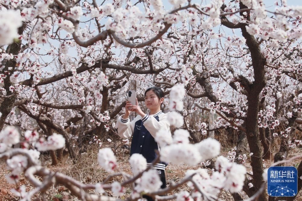 3月23日,游人在山東省臨沂市平邑縣一處杏花園里拍照游玩。新華社發(fā)(武紀全攝)