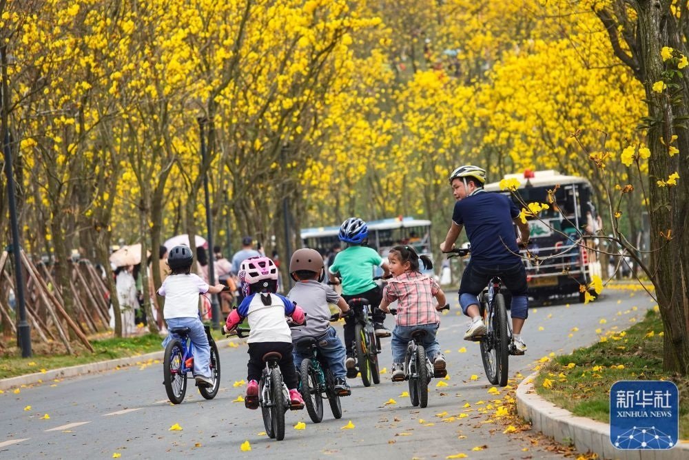3月23日,在廣西南寧市青秀山景區(qū)風鈴谷,游人騎自行車在黃花風鈴木花海長廊暢游。新華社發(fā)(喻湘泉攝)