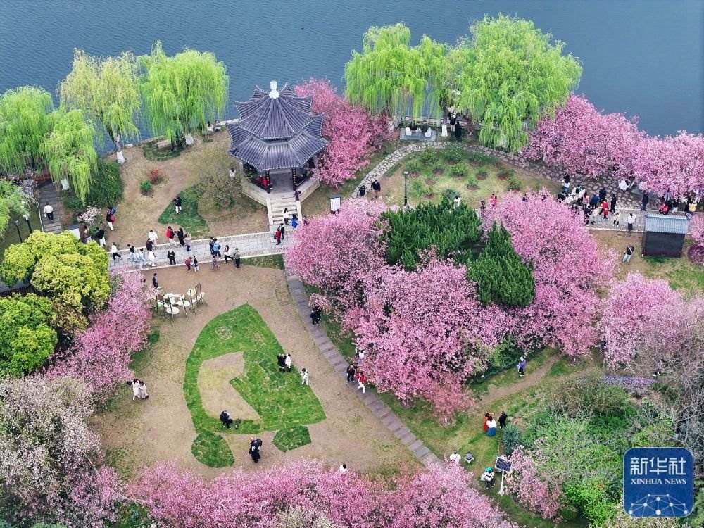3月23日,游客在南京莫愁湖公園內賞花游玩(無人機照片)。新華社發(fā)(楊素平攝)