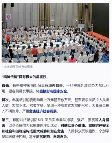 ·起底被公安機關(guān)打擊查處的“靈修”組織:打著“靈修”“靈魂塑造”等旗號,對學(xué)員實施精神控制;借“靈修”提升之名,行“精神傳銷”之實。鄧海鵬及其創(chuàng)辦的培訓(xùn)機構(gòu),打著“靈魂塑造”“集體場域”的幌子,對學(xué)員進行精神控制,然后以傳銷、加盟、進階等現(xiàn)代營銷模式達到斂財漁色目的。人前他要求學(xué)員全部吃素,自己每天大魚大肉,必吃海參;人前他要求學(xué)員不能有不動產(chǎn)、錢是修行來的,自己卻拿著騙來的錢去買理財產(chǎn)品;人前他無兒無女,實則有妻有女;人前假裝不近女色,背地里卻漁色女學(xué)員。