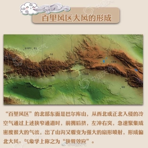 “百里風(fēng)區(qū)”的北部東面是巴爾庫山,從冷空氣通過上述狹窄通道時(shí),前擁后擠,左沖右突,急速聚集成密度很大的氣流,出了山溝又驟變?yōu)閺?qiáng)大的扇形噴射。