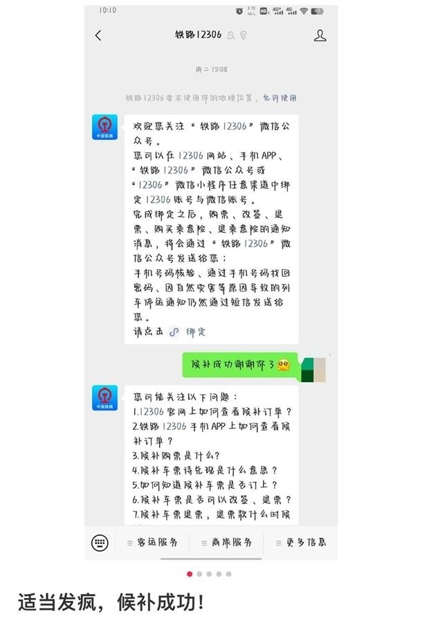 “你不理我是因為在給我候補嗎”“親愛的我要票”……另一名網(wǎng)友也發(fā)帖稱,自己使用向12306微信公眾號“發(fā)瘋”的辦法,成功候補到了車票,其發(fā)布的網(wǎng)帖題為“適當(dāng)發(fā)瘋候補成功”。