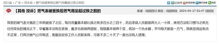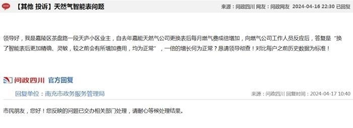 中新網(wǎng)4月17日電(中新財經(jīng)記者 吳濤)近日,在“問政四川”平臺上,不少網(wǎng)友反映“更換新表后燃?xì)赓M異常上漲”,這些留言顯示來自四川成都、自貢、廣安、南充等多地,僅僅在4月16日,保守估計就有十幾條;17日上午又出現(xiàn)十幾條。大部分尚未得到回復(fù),部分獲得官方回復(fù)稱“留言已轉(zhuǎn)交給相關(guān)機構(gòu)進(jìn)行處理”。