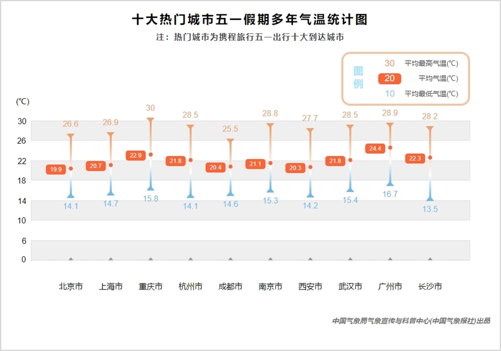 熱門城市中,北京5月1日至4日以晴為主,最高氣溫在26℃至28℃,適宜出行游玩,5日預計將出現(xiàn)小雨,氣溫略有下降。西安則在4日會出現(xiàn)小雨,其他時間以多云和陰天為主,氣溫在23℃上下,非常適宜出行。位于中東部地區(qū)的上海、杭州、南京等熱門城市5月1日-3日均以多云和陰天為主,最高氣溫均在20℃左右,溫度適宜,4至5日將出現(xiàn)小雨,出行還需注意做好防雨準備。長沙和武漢3日至4日將出現(xiàn)中雨至大雨天氣,不適宜戶外游玩。位于西南地區(qū)的成都和重慶“五一”假期前四天都將被小雨籠罩,直到5日才會放晴。