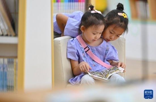 5月2日,家長(zhǎng)帶著孩子在位于??谑械暮D鲜D書(shū)館讀書(shū)。