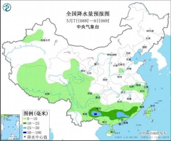 全國降水量預(yù)報(bào)圖(5月6日08時(shí)-7日08時(shí))