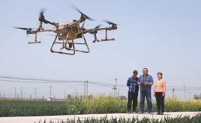 薛麗娜(右一)指導(dǎo)村民使用無(wú)人機(jī)噴灑農(nóng)藥。陳 陽(yáng)攝
