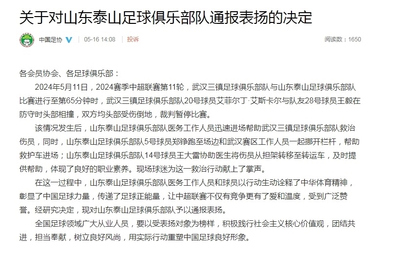 ·幫助救治武漢三鎮(zhèn)足球俱樂部隊(duì)傷員,中國足協(xié)通報(bào)表揚(yáng)山東泰山俱樂部。