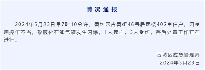 央視網(wǎng)消息:哈爾濱市香坊區(qū)應(yīng)急管理局發(fā)布情況通報(bào),2024年5月23日早7時(shí)10分許,香坊區(qū)古香街46號(hào)居民樓402室住戶(hù),因使用操作不當(dāng),致液化石油氣罐發(fā)生閃爆,1人死亡,3人受傷。善后處置工作正在進(jìn)行。