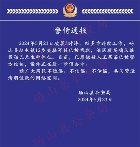·安徽碭山12歲男孩失聯(lián)3天后遺體被找到,警方通報(bào):嫌犯被控制。