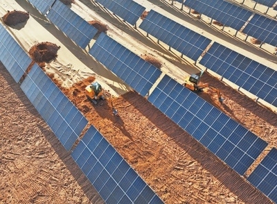 不遠處的光伏板下,一臺臺挖土機正在進行覆土作業(yè)。