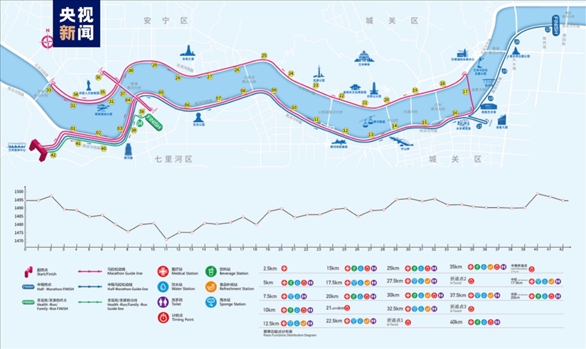 馬拉松所有項(xiàng)目起點(diǎn)為蘭州奧體中心,全程馬拉松終點(diǎn)與起點(diǎn)相同,半程馬拉松終點(diǎn)在南濱河?xùn)|路(軌道二號(hào)線雁白大橋站附近),健康跑和家庭跑終點(diǎn)在馬灘北路十字。
