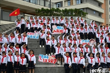 四川省內(nèi)江市東興區(qū)牛牦山小學(xué),新入隊(duì)的少先隊(duì)員們一起分享獲得紅領(lǐng)巾的喜悅。