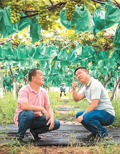 陳李波(右)在崇賢村葡萄種植園與農(nóng)戶(hù)一起察看葡萄長(zhǎng)勢(shì)。錢(qián)麗君攝