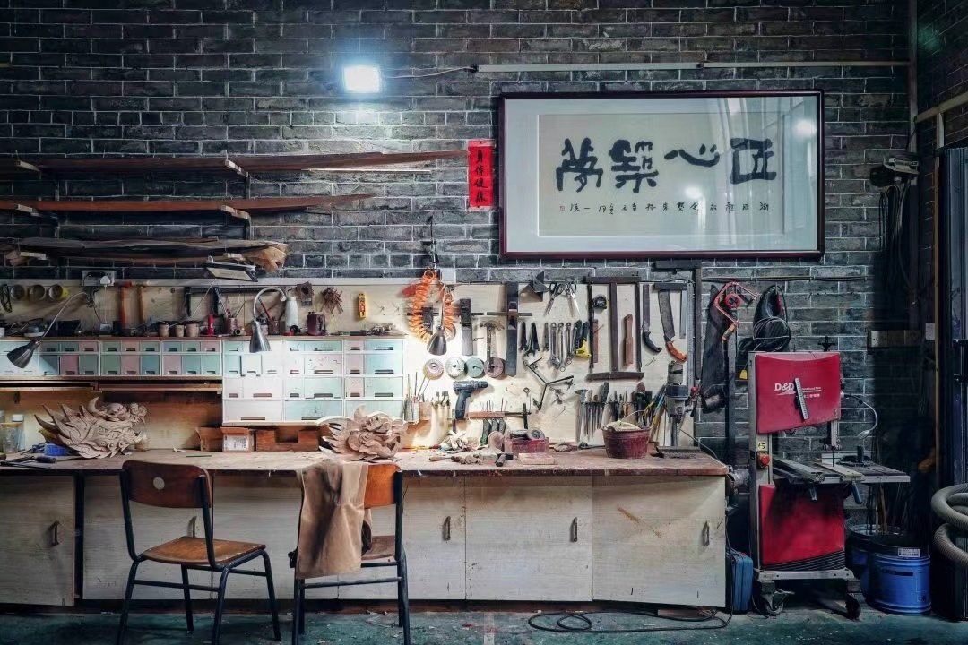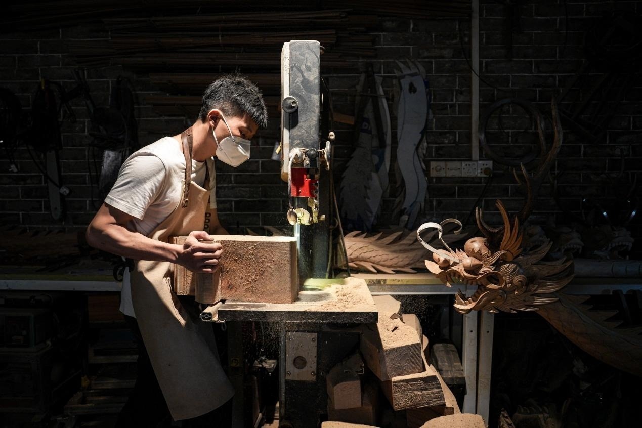 張偉潮身上的傷也沒(méi)斷過(guò)。“天天跟刀打交道,有時(shí)候傷口剛縫了線,回到家一干活,刀口又開(kāi)了”,手臂上、手背上遍布的傷疤,見(jiàn)證了每一個(gè)龍頭的誕生?!懊肯乱坏叮叶家呀?jīng)想好了后面的第二步、第三步”,龍頭雕刻極為考究,從選料、切割,到粗雕、精雕,再到打磨、拋光、裱漆,十幾道繁瑣工序,全靠師傅的眼光和手藝。機(jī)械化、流水線,做不出龍頭嗎?在數(shù)不清的日夜里,光影斑駁間,張偉潮拿著父輩傳下的一刀一錘,一下一下,慢慢開(kāi)鑿,給出自己的答案。