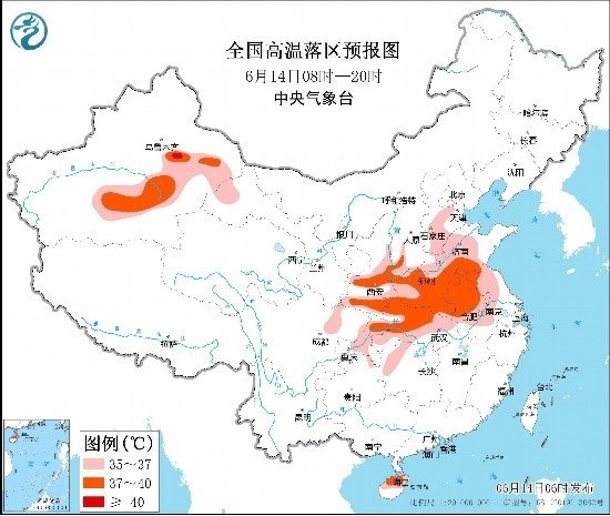 預(yù)計6月14日至15日,河北中南部、山西南部、陜西大部、黃淮、江淮、湖北北部以及內(nèi)蒙古西部、新疆南疆盆地等地有高溫天氣,局地可達40℃以上。