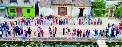 在青田,藝術(shù)讓這個(gè)村落慢慢蘇醒,也讓青田人對(duì)家鄉(xiāng)充滿驕傲與自豪。除了青田水鄉(xiāng)藝術(shù)季、“上善若水——藝術(shù)龍舟行動(dòng)”等活動(dòng),一場“走田”主題時(shí)裝秀,更是點(diǎn)燃了村民的熱情。穿著設(shè)計(jì)師以鄉(xiāng)村生產(chǎn)生活為靈感設(shè)計(jì)的服裝,佩戴著自己親手制作的香云紗配飾,道具是平日田間勞作的老物什,村民“模特”們雖面露羞澀,但走在自己最熟悉的鄉(xiāng)野,走出的是自信、堅(jiān)定的步伐,仿佛在告訴每一個(gè)人,這就是我們的生活,我們的時(shí)尚。