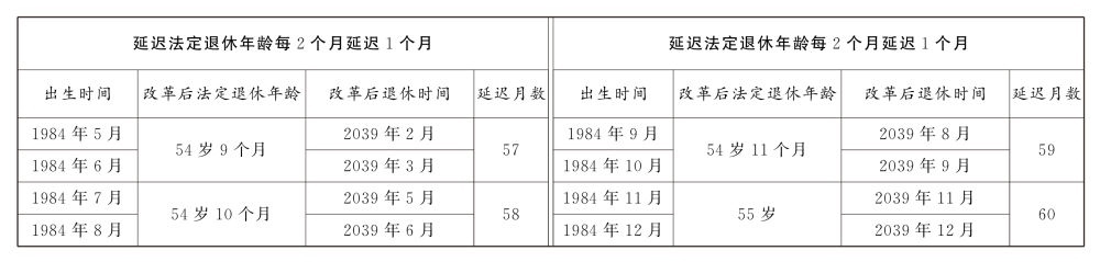 一、同步啟動延遲男、女職工的法定退休年齡,用十五年時間,逐步將男職工的法定退休年齡從原六十周歲延遲至六十三周歲,將女職工的法定退休年齡從原五十周歲、五十五周歲分別延遲至五十五周歲、五十八周歲。