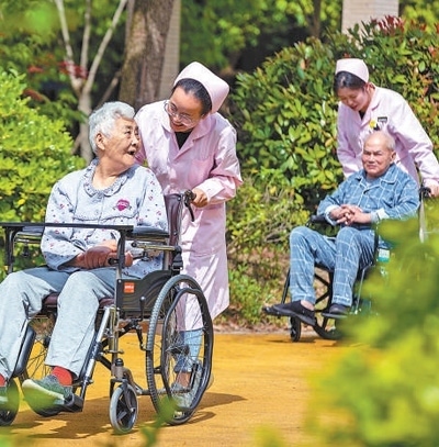 江蘇省南通市通州區(qū)一家頤養(yǎng)中心,護(hù)理人員推著老人在花園散心。翟慧勇攝(影像中國)