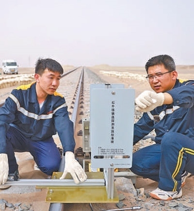 臺(tái)欣龍(右)和同事在對紅外線軸溫探測設(shè)備探頭進(jìn)行方位角矯正。