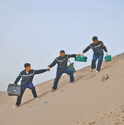 “今天這一路,算順利的。”臺(tái)欣龍說,“假如某個(gè)檢測站發(fā)出故障警報(bào),無論什么天氣,都必須立即響應(yīng)?!痹诹_布泊,沙塵暴說來就來,一刮就是三四個(gè)小時(shí)。有一回,他們遇上特大沙塵暴,風(fēng)暴像堵墻一樣迎面撲來。越野車迎風(fēng)的一側(cè),車漆幾乎全被風(fēng)沙打掉?!靶姨澑浇凶鶚蚝?,大伙兒在里頭躲了3個(gè)多小時(shí)?!憋L(fēng)暴過后,衣服上、頭發(fā)上、耳朵里、鼻孔里全都是沙子。一抬腳,鐵道路基上的風(fēng)沙已沒過膝蓋。