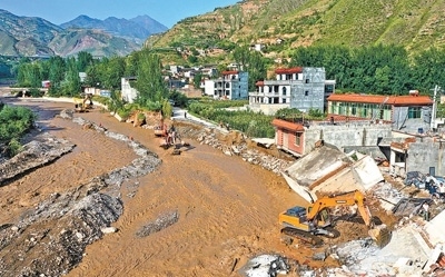 7月25日,在甘肅省隴南市武都區(qū)三河鎮(zhèn)竹林村,救援人員搶修水毀路段。新華社記者 郎兵兵攝