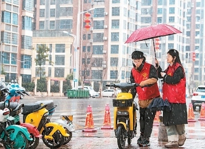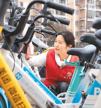江西贛州興國縣長征社區(qū)志愿者在街頭整理共享單車。陳 鵬攝(人民視覺)