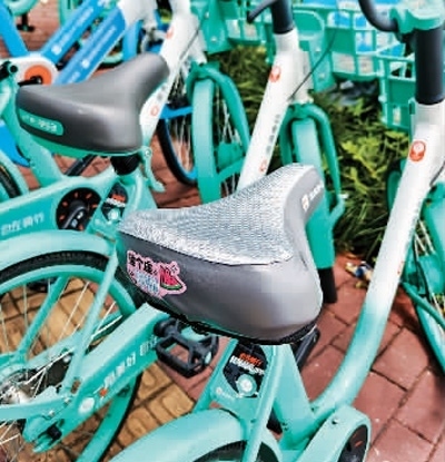 為了應(yīng)對炎熱天氣,上海街頭一些共享單車換上了“清涼坐墊”。王 初攝(人民視覺)