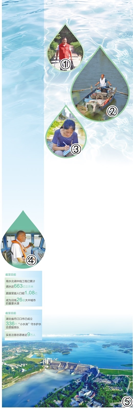 圖①:涂青海在巡線時撿拾垃圾。段 浩攝 圖②:蔣德新在巡護。丹江口市委宣傳部供圖 圖③:廖思盈在記錄水質采樣數據。漢江師范學院供圖 圖④:肖安山在駕駛清漂船。鄖陽區(qū)委宣傳部供圖 圖⑤:丹江口水庫鳥瞰。丹江口市委宣傳部供圖 數據來源:中國南水北調集團有限公司、丹江口市委宣傳部