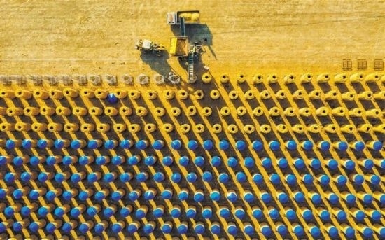 10月15日,浙江省樂(lè)清市勝利塘內(nèi)的“農(nóng)光互補(bǔ)”光伏發(fā)電項(xiàng)目基地,農(nóng)戶(hù)將收割好的稻谷裝袋。蔡寬元攝(中經(jīng)視覺(jué))