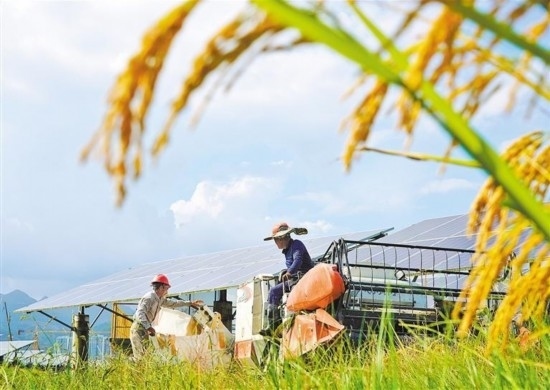10月10日,湖南省東安縣紫溪市鎮(zhèn)中心村,農(nóng)民在高標(biāo)準(zhǔn)農(nóng)田收獲晚稻。今年前三季度,全國(guó)夏糧早稻產(chǎn)量合計(jì)17795萬(wàn)噸,比上年增加346萬(wàn)噸,增長(zhǎng)2.0%。蔡小平攝(中經(jīng)視覺(jué))