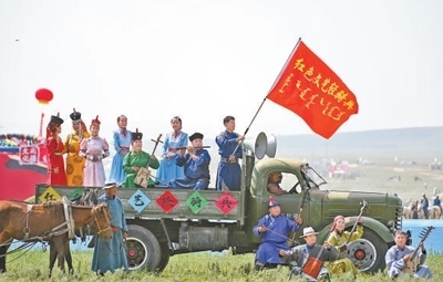 滋潤(rùn)人心“紅色文藝輕騎兵”烏蘭牧騎隊(duì)員在內(nèi)蒙古草原那達(dá)慕開(kāi)幕式上表演。新華社記者 貝 赫攝