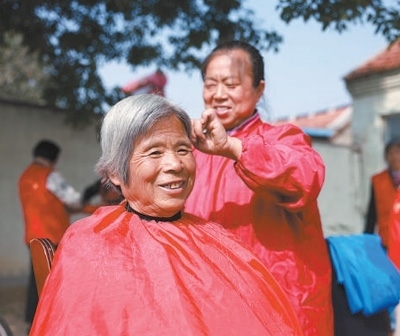 德化人心山東省東營(yíng)市廣饒縣開(kāi)展形式多樣的活動(dòng),弘揚(yáng)愛(ài)老敬老的優(yōu)良傳統(tǒng)。圖為在廣饒縣李鵲鎮(zhèn)趙寺村,志愿者為老人理發(fā)。劉云杰攝(影像中國(guó))