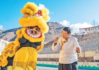 凝聚人心融合了漢藏特色表演形式的碩督鎮(zhèn)獅子舞,見(jiàn)證著西藏各民族交往交流交融的歷史。鄧巴阿尼是西藏昌都市非物質(zhì)文化遺產(chǎn)碩督鎮(zhèn)獅子舞的傳承人,近年來(lái)致力于獅子舞傳承。圖為鄧巴阿尼(右)在昌都市洛隆縣碩督鎮(zhèn)小學(xué)指導(dǎo)學(xué)生跳獅子舞。新華社記者 丁增尼達(dá)攝