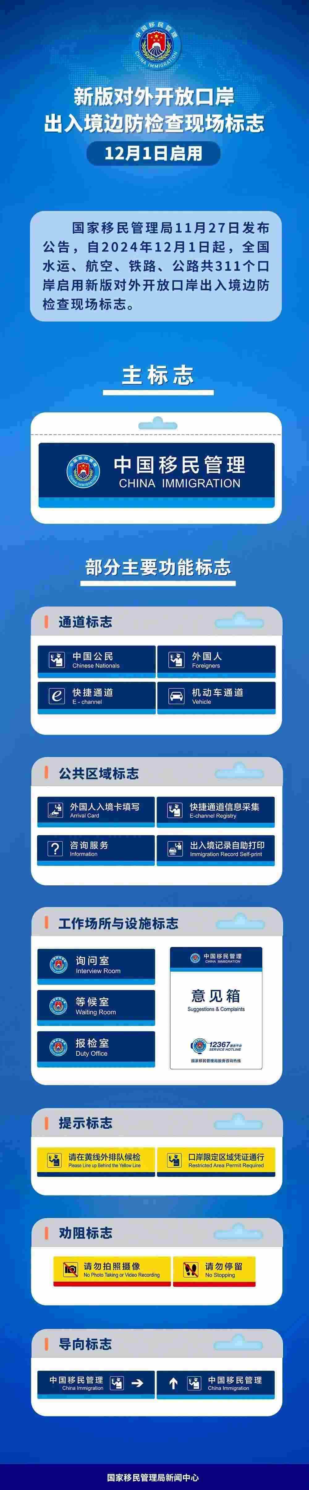 國(guó)家移民管理局:新版對(duì)外開放口岸出入境邊防檢查現(xiàn)場(chǎng)標(biāo)志12月1日啟用