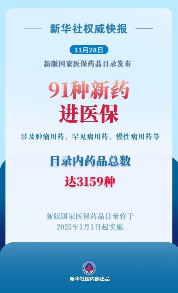 自成立以來,國家醫(yī)保局已連續(xù)7年開展醫(yī)保藥品目錄調(diào)整工作。本次調(diào)整后,目錄內(nèi)藥品總數(shù)將增至3159種,腫瘤、慢性病、罕見病、兒童用藥等領(lǐng)域的保障水平得到提升。新版國家醫(yī)保藥品目錄將于2025年1月1日起實施。