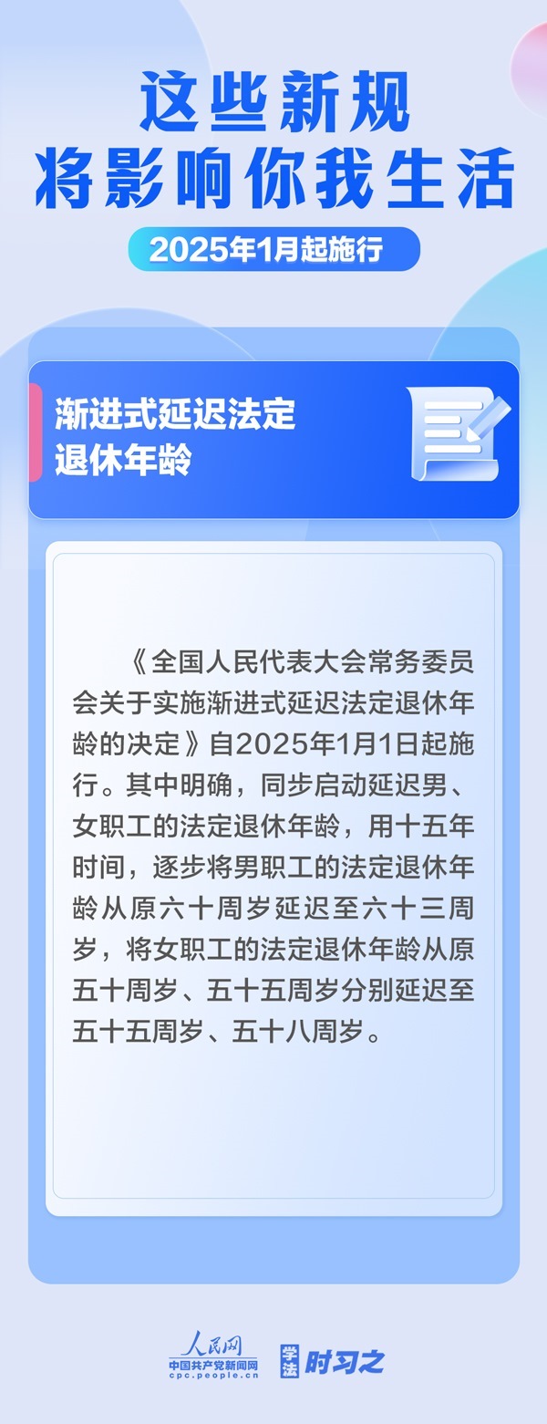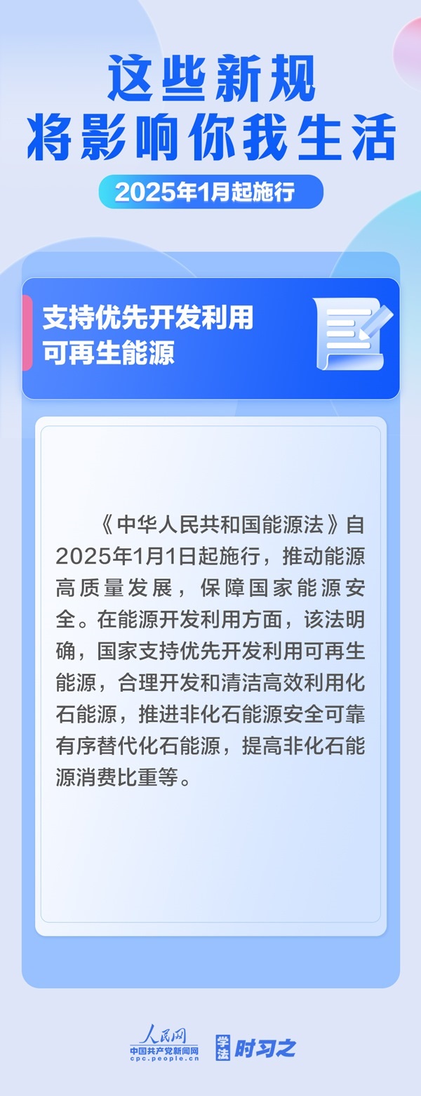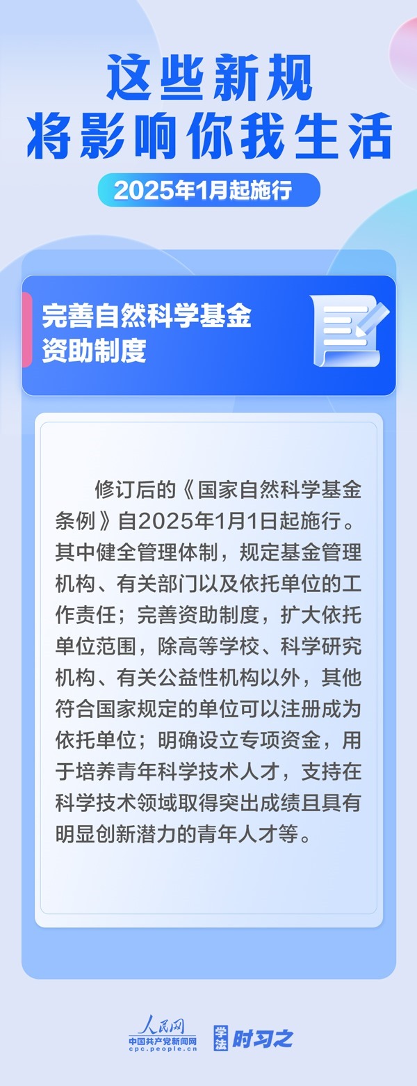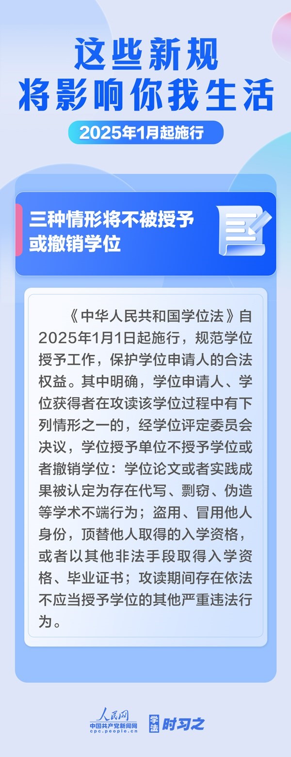 明確不授予學(xué)位或者撤銷學(xué)位的三種情形;支持優(yōu)先開發(fā)利用可再生能源;漸進式延遲法定退休年齡;完善自然科學(xué)基金資助制度……2025年1月起,這些新規(guī)施行,將影響你我生活。