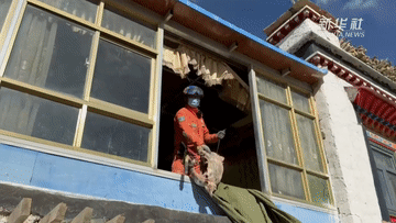 在定日縣措果鄉(xiāng)野江村,消防員在活動板房上安置國旗(1月13日攝)。(新華社記者 丁增尼達 攝)