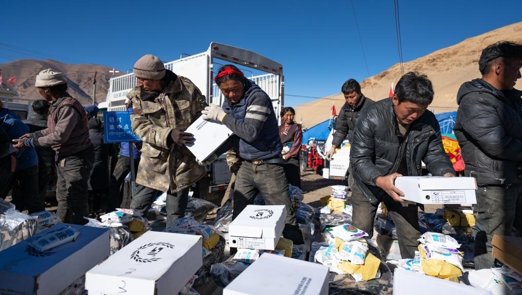1月10日,在定結(jié)縣郭加鄉(xiāng)切村安置點,群眾分配救災(zāi)物資。(新華社記者 丁增尼達 攝)