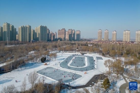 1月18日,人們在哈爾濱市丁香公園內(nèi)體驗冰上運動(無人機照片)。