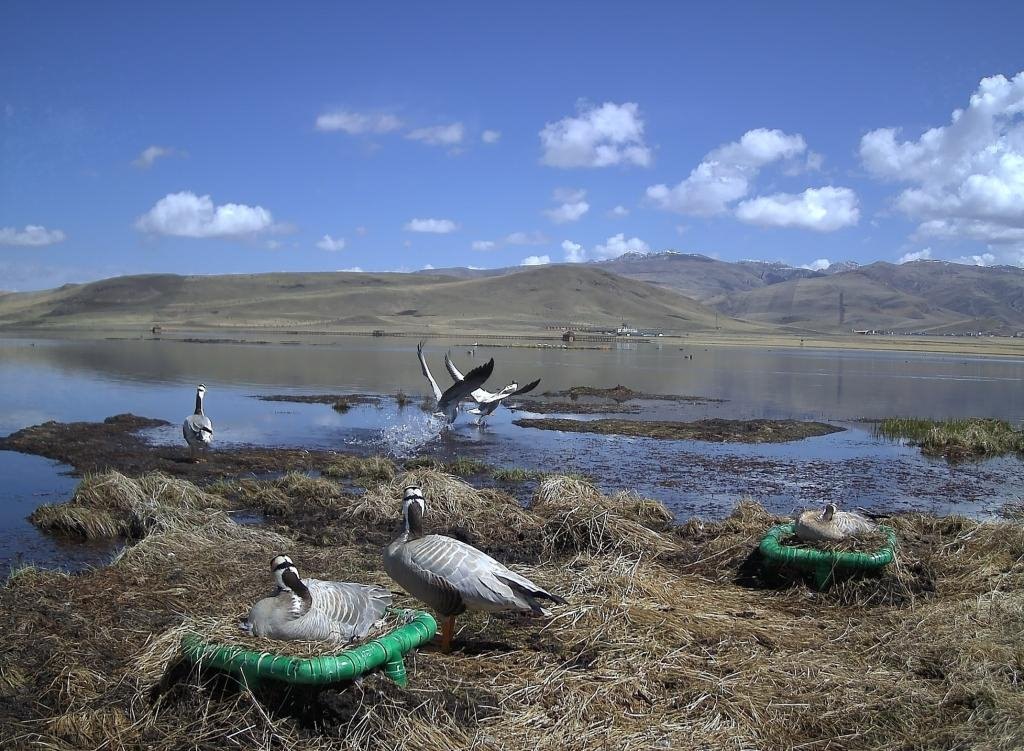 在甘肅尕海則岔國家級自然保護(hù)區(qū),棲息的斑頭雁通過人工鳥巢坐巢孵化后代(資料照片)。新華社發(fā)(甘肅尕海則岔國家級自然保護(hù)區(qū)管理局供圖)