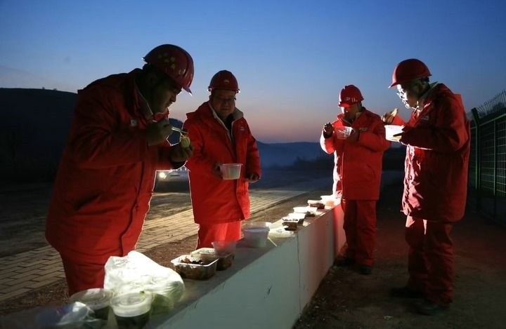 1月28日,長慶油田第二采油廠搶險(xiǎn)隊(duì)員在井場(chǎng)吃了一頓特殊的“年夜飯”。新華社發(fā)